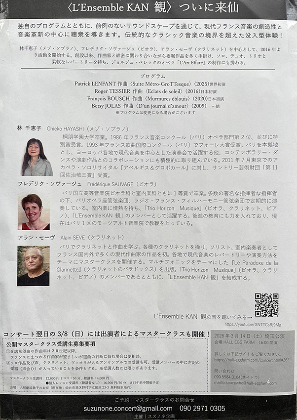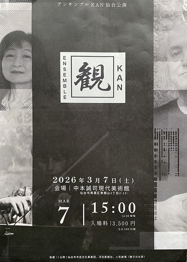 2026年展覧会&コンサートのご案内 2026年展覧会&コンサートのご案内 3月7日(土)15:00開演 アンサンブルKAN仙台公演 ![]() 独自のプログラムとともに、前例のないサウンドスケープを通じて、 現代フランス音楽の創造性と音楽革新の中心に聴衆を導きます。 伝統的なクラシック音楽の境界を超えた没入型体験! 開場/14:30 開演/15:00 入場料3,500円(当日500円増) お席のご予約/suzunone.concert@gmail.com TEL.090-2971-0305 3月28日(土)15:30開場/16:00開演 〜森下幸路ヴァイオリン・リサイタル〜 ![]() 〜森下幸路ヴァイオリン・リサイタル〜今年も中本美術館にて、森下幸路ヴァイオリン・リサイタルが行われます🎻✨ 情熱的で優美なヴァイオリンの音色をどうぞご堪能ください♪ 2026年3月28日(土)16時開演。 {全席自由}4,000円 学生3,000円 《チケットご予約受付中❗️》 ★ご予約・お問い合わせは、お電話または、メールにて受付中。 ☎022-272-7100 ✉office@seishi-nakamoto.com ※駐車場はございません。公共機関をご利用ください。 ![]() 2025.9.21 中本誠司現代美術館 理事長大内光子著/『杖2本で生きる。』本を販売中です。 困難な道を歩め!"と自分自身を鼓舞しながら、明るく前を向いて歩んできた歳月が、ペンによって紡がれ一冊の本になりました。 学生時代から続いた合唱団の仲間との繋がり。宿命的出会いだった芸術家・中本誠司との日々。 そして、家業を引き継ぎ、仕事に邁進し、経営に手腕を奮ってきた軌跡を手紙・寄稿文・記事などを交えながら振り返ります。 ハンディキャップを抱えながらも精一杯人生を謳歌し、多くの仕事をこなし、出会いを重ね、 一人の芸術家を愛した大内光子さんと周囲の人々とのつづれおりのような自叙伝です。 ※限定15冊の販売となります。 ご購入希望の方、メールかお電話で美術館へお問い合わせください。 【本の価格について】 1冊3,000円(送料300円込み)