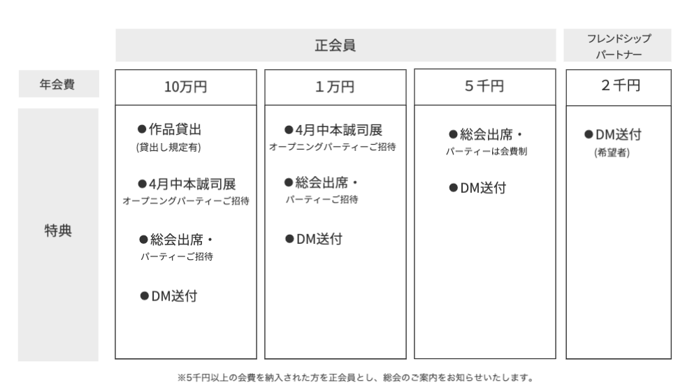| 1万円 | ⚫︎4月中本誠司展オープニングパーティーご招待 ⚫︎総会出席・パーティーご招待 ⚫︎美術館関連イベントDM送付 |